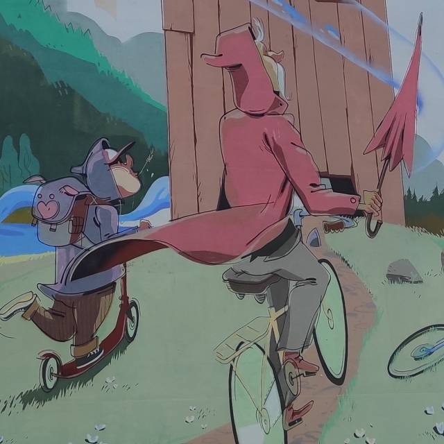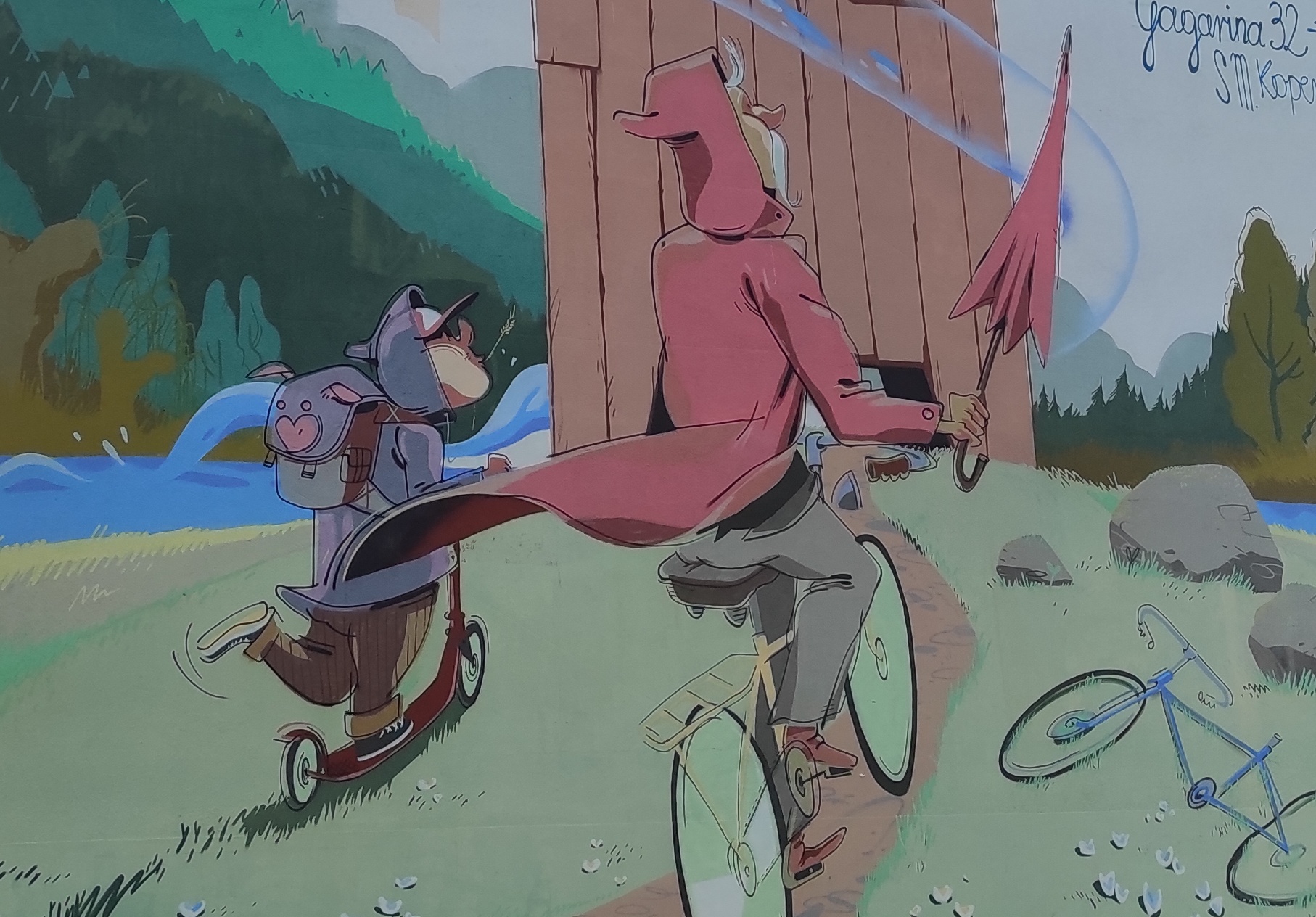 ul. Gagarina 32 > Mural przedstawiający scenkę nawiązującą do powieści o Don Kichocie można znaleźć na bocznej ścianie jednego z bloków stojących przy ul. Gagarina, mieszczącej się w okolicach miasteczka uniwersyteckiego. Malowidło autorstwa Andrzeja Poprostu powstało w 2016 r.