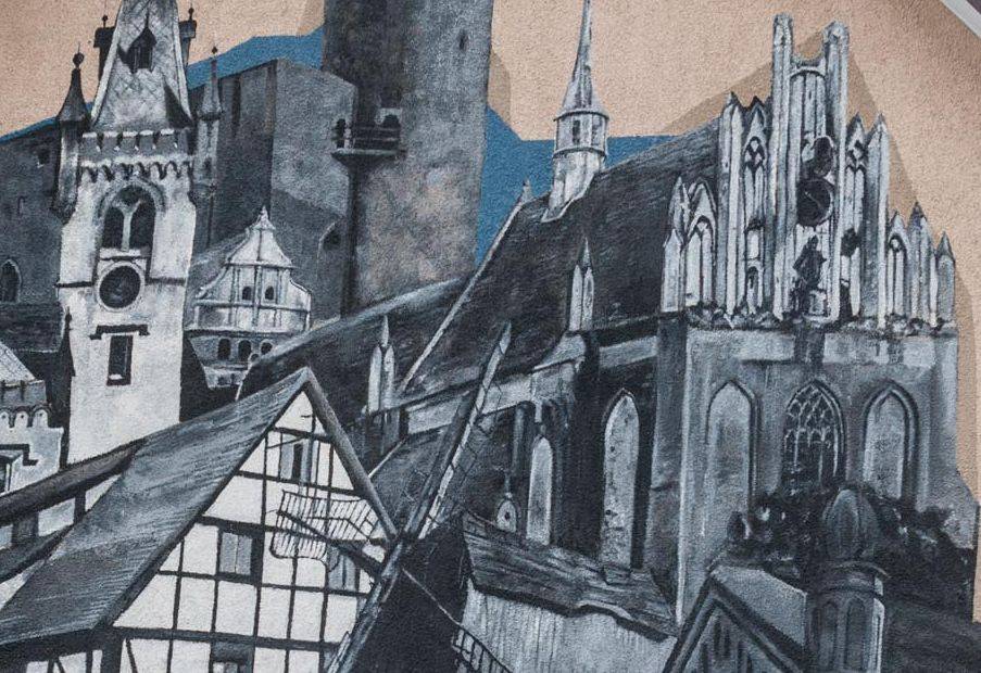 Kolejnym ciekawym muralem zrealizowanym w ramach Budżetu Obywatelskiego jest opowieść o architekturze miasta… Dzieło Dominiki Dziedziny, na dużym formacie prezentują najciekawsze obiekty Świecia – te istniejące i te, które niestety zniknęły z krajobrazu. Wśród uwiecznionych zabytków znajdziesz majestatyczny zamek krzyżacki, starofarny kościół, a także nieistniejące już: synagogę z ul. Klasztornej, wiatrak, który stał na terenie obecnego osiedla 800-lecia do 1963 roku, kościół ewangelicki stojący przy rynku starego Świecia, zanim miasto przeniesiono w XIX w. w obecne miejsce, młyny w Przechowie i "klasztorek". Każdy element opowiada unikalną historię miasta, tworząc niesamowitą mozaikę przeszłości i teraźniejszości. Mural to nie tylko dekoracja – to także ilustrowany przewodnik po bogatej historii Świecia, dzięki któremu można poznać miejsca, które kształtowały to miasto.